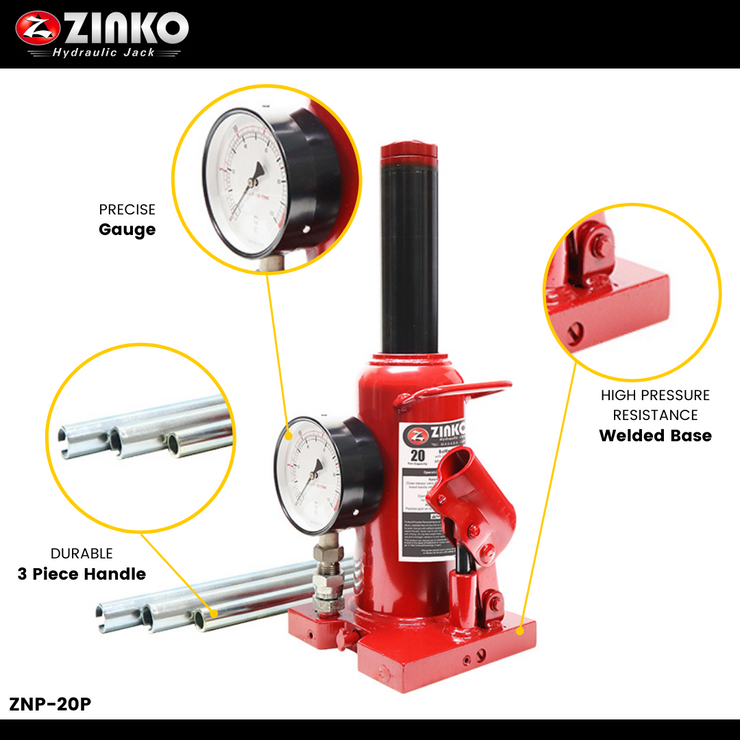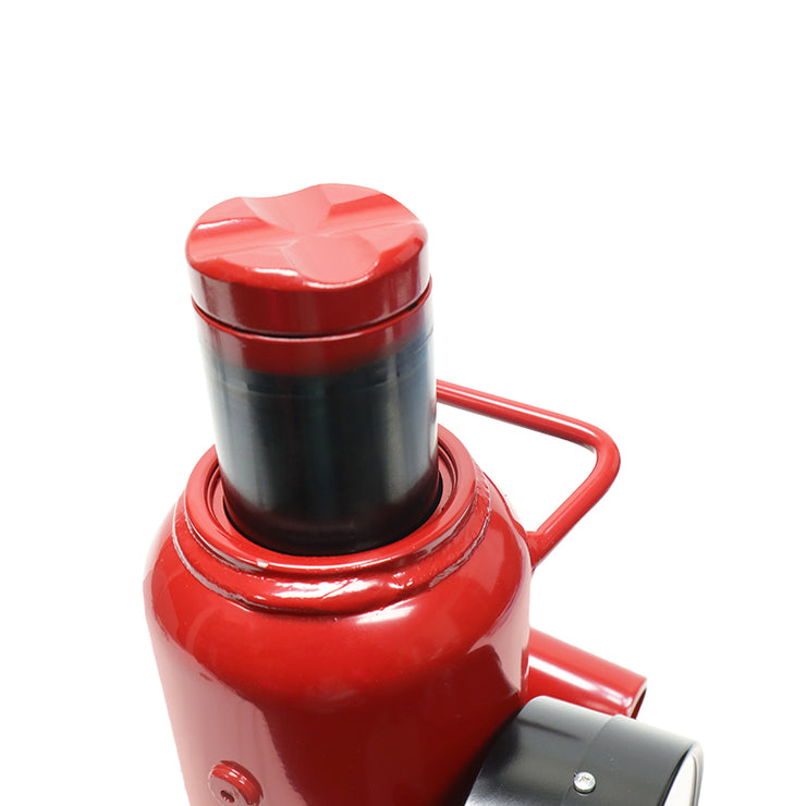 Designed to distinctly display the force output by the jack on a large 4" gauge. Heavy duty hydraulic bottle jack; ideally used in automotive, machinery, and construction industry.