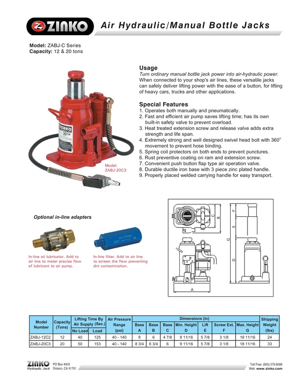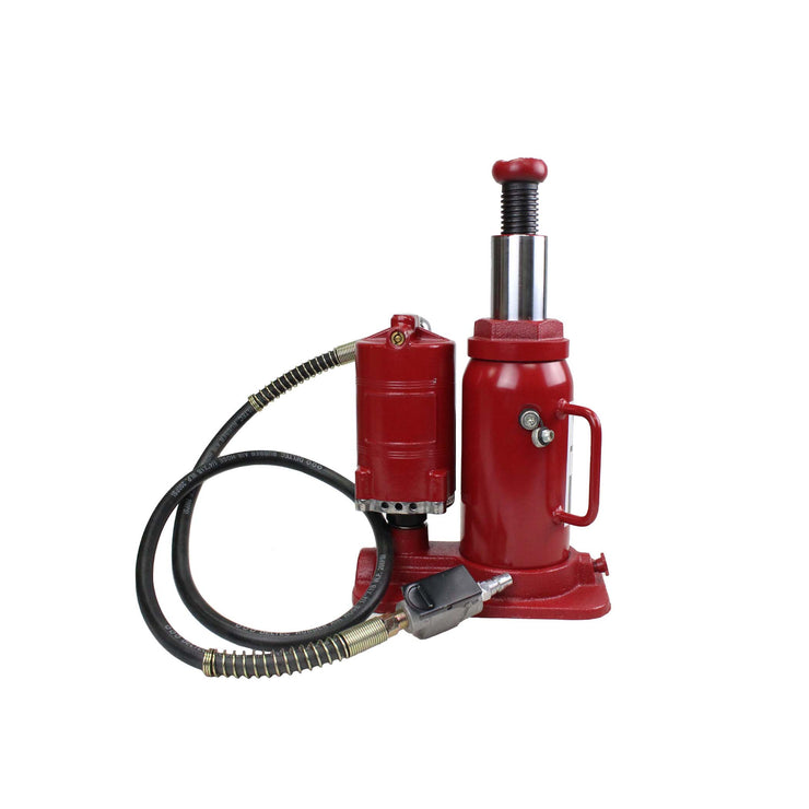durable air hydraulic bottle jack; fast efficient air pump with built in safety valve; in-line screen attached prevents contamination of air hydraulic system; convenient push button flap type air operation valve.